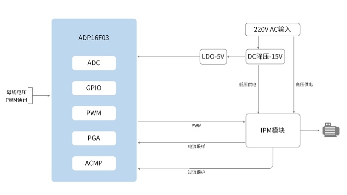 ADP16F03搭載16位定點DSP內(nèi)核(主頻150MHz,哈佛總線結(jié)構(gòu)),集成運算加速單元(支持除法、開方和帕克變換等指令),高效運行單電阻無感FOC算法,實現(xiàn)微秒級電機控制關(guān)鍵運算,為壓縮機與外風(fēng)機協(xié)同調(diào)節(jié)提供強力算力保障。